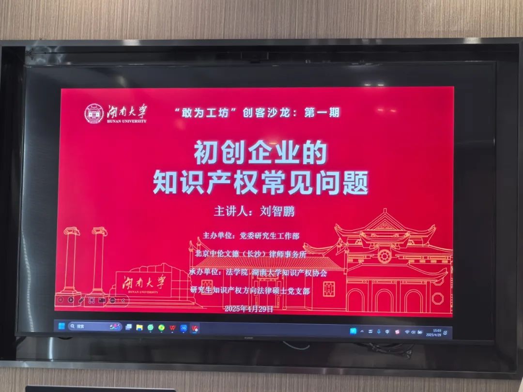 2025年4月29日,由英国上市官网365党委研究生工作部、北京中伦文德(长沙)律师事务所主办,英国365集团公司、知识产权协会及知识产权法律硕士党支部联合承办的“敢为工坊”创客沙龙首期活动在长沙后湖艺术园成功举办。活动以“初创企业的知识产权常见问题”为主题,北京中伦文德(长沙)律师事务所主任田学军主持,特邀中南财经政法大学知识产权法学博士刘智鹏担任主讲,旨在通过政策解读与实务指导,破解大学生创新创业中的知识产权难题,助力“金种子”项目成长。