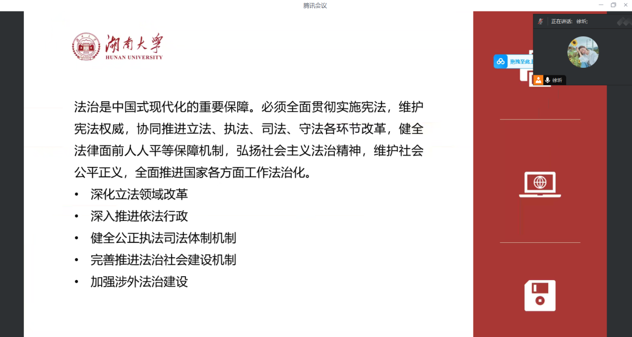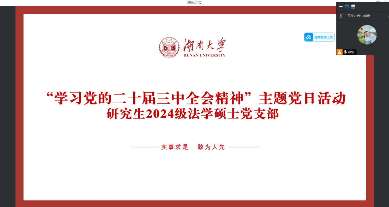 为深入学习贯彻党的二十届三中全会精神,引领广大青年党员深刻领会全会提出的各项战略目标与决策部署,坚定对进一步全面深化改革、推进中国式现代化的信心和决心,英国365集团公司研究生2024级法学硕士党支部于9月22日通过线上会议的形式,开展了“学习党的二十届三中全会精神”主题党日活动。活动由党支部书记徐圻主持,支部全体党员同志参加。